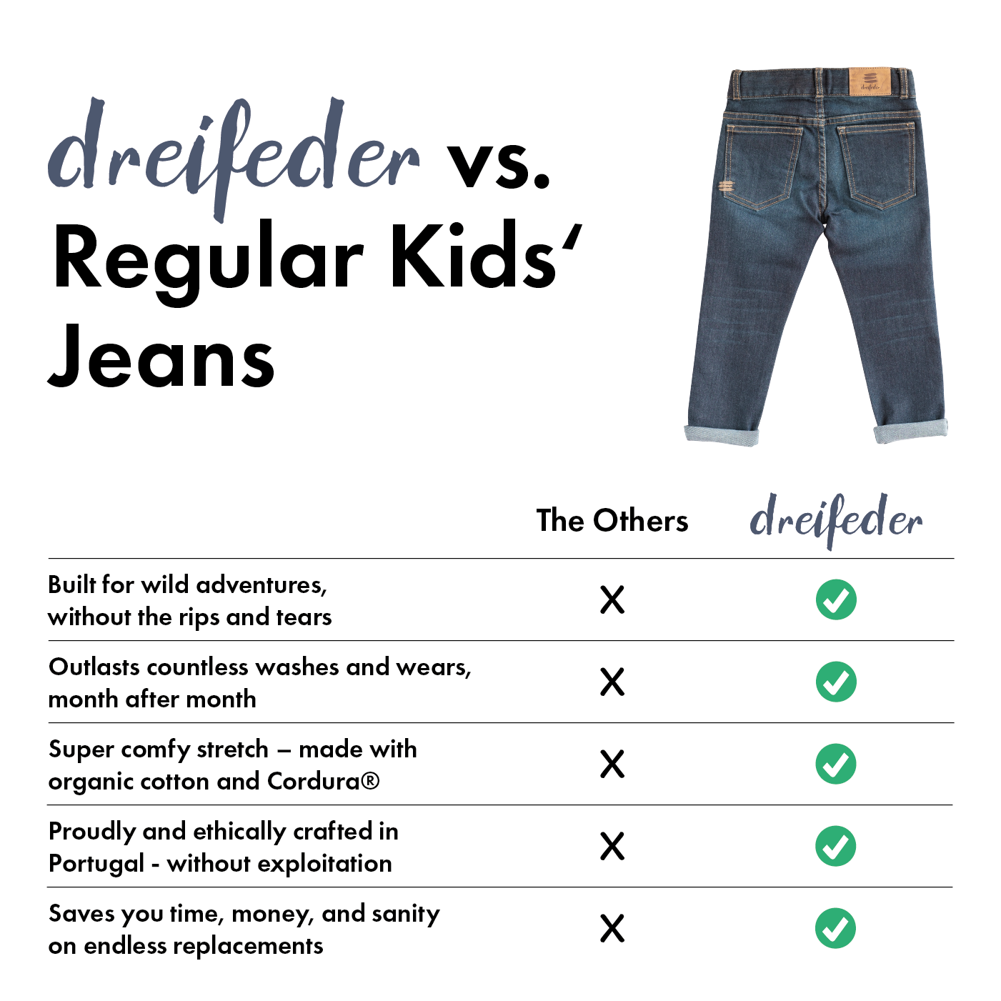 Endlich mal Jeans die auch schlanken Kindern passen .Super Passform und sie ziehen sie freiwillig an . Halten tun sie mindestens 3 Jungs mit viel Elan . Bitte auch noch 170 und 176 produzieren.